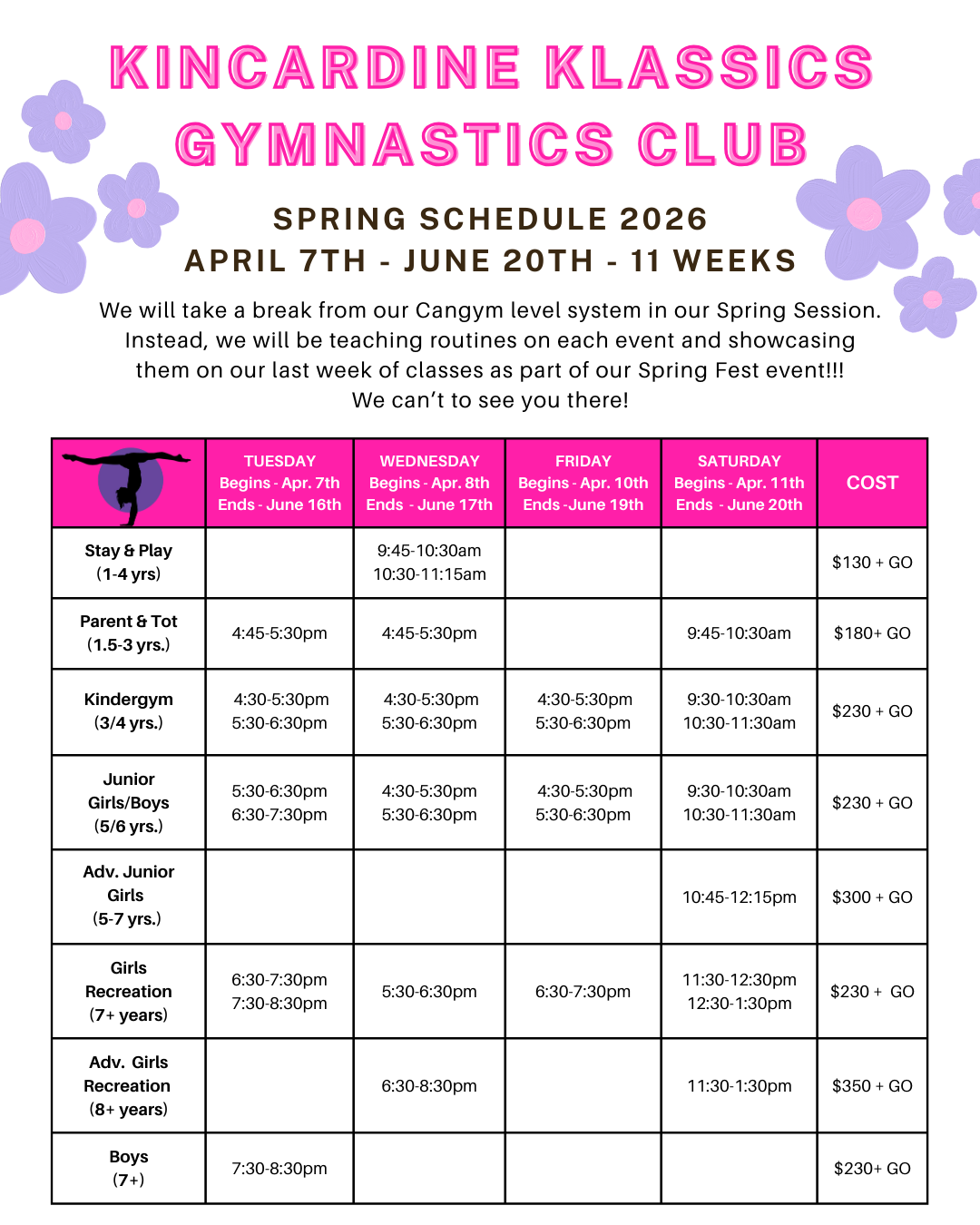 All athletes are required to pay the $45.00 GO (Gymnastics Ontario) fee for the calendar year of July 1st, 2026 - June 30th, 2027.