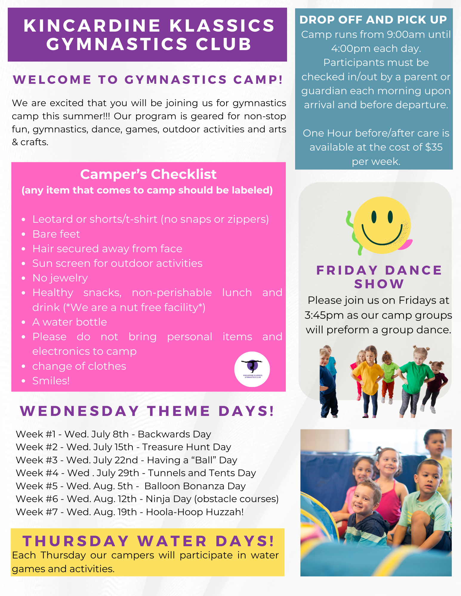 6. Any gym closures due to inclement weather will be posted on our Facebook page and emailed to families by 3:00pm. We will do our best to provide a makeup class at the end of the session.